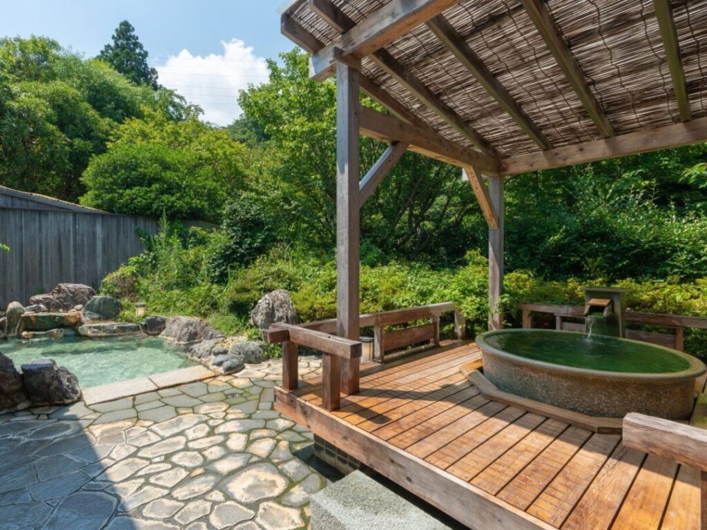 個性豊かな12の湯舟でプチ湯めぐりを楽しみます。豊富な湯量を誇る源泉を贅沢にかけ流したたくさんのこだわり温泉でお気に入りの湯舟を見つけて湯浴みできます。伊豆で穫れた沢山の海の幸と山の幸をふんだんに使用した料理と開放感あふれる客室で寛ぐ極上時間を編み出すことができる旅館ですが、滞在を全力で愉しむことができるポイントが他にもあります。