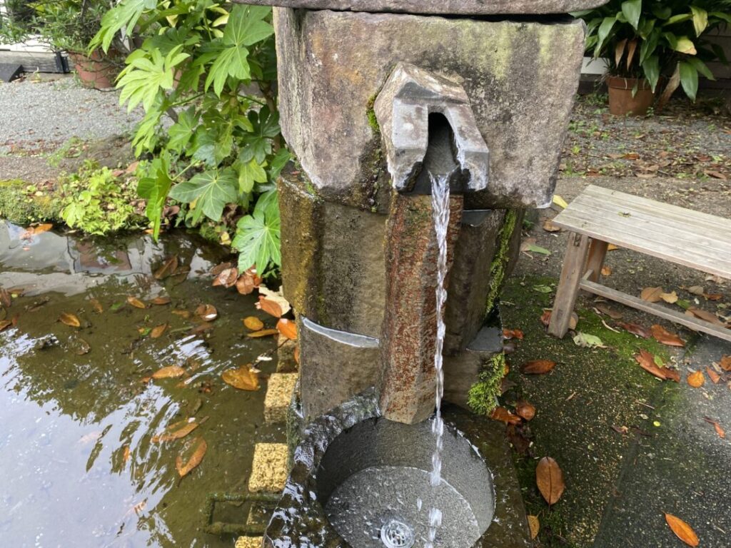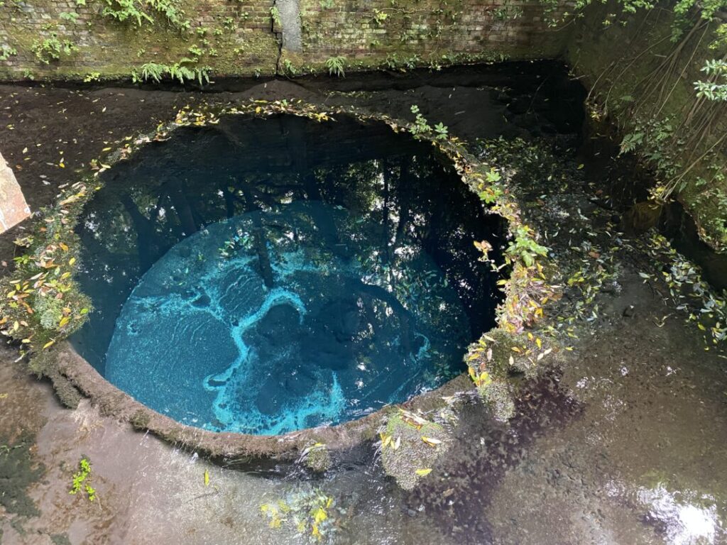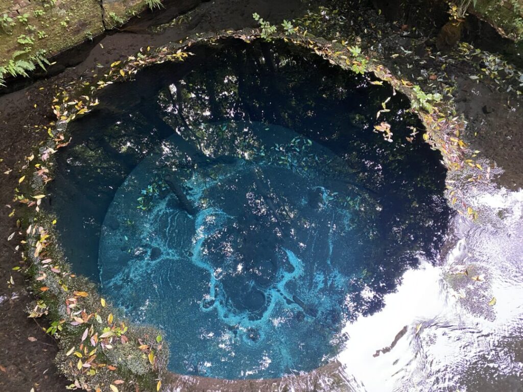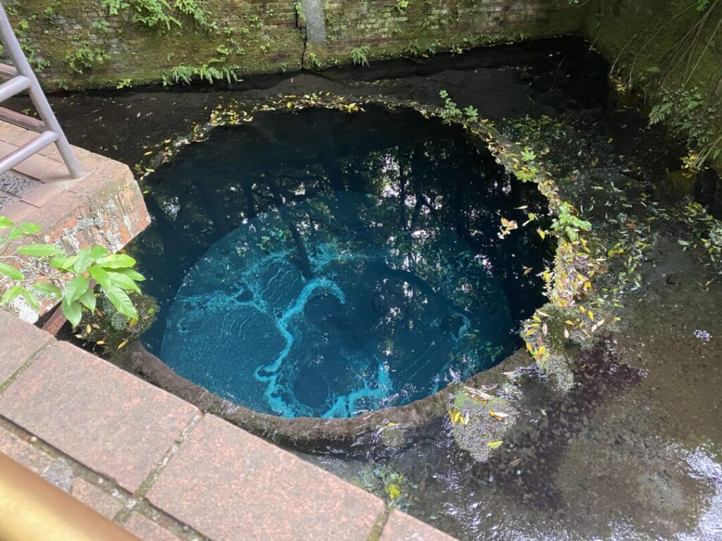 園内には数十か所の「湧き間」があり、水が地中から勢いよく湧き出す様子を間近で見ることができます。この清らかな水は自由に汲んで持ち帰ることが可能です。